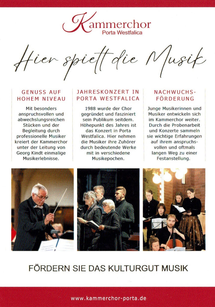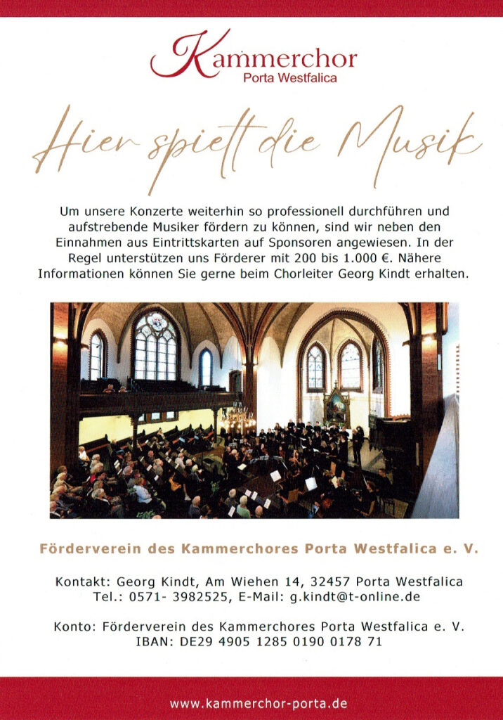 Die Proben sind donnerstags von 20.00 – 22.00 Uhr im Forum des Städtischen Gymnasiums Porta Westfalica. Während der Schulferien von NRW ist probenfreie Zeit.